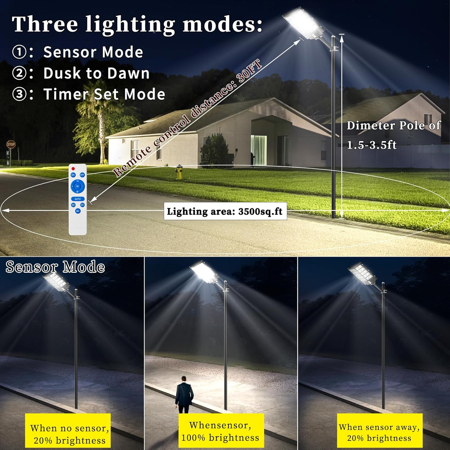 - 【Upgrade Led Beads】: Ofuray Of-6000W solar street lights outdoor uses 180pcs super-bright 5054 high-power led lamp beads. It provides high brightness and low power consumption which makes street lights more energy efficient, longer life and safer to use.The double-sided 45-degree angle design has brighter light up to 400000lm. The double-sided 45-degree angle design has brighter light and a wider range than ordinary street lights, which can bring 220-degree ultra-wide-angle lighting and cover an area of 3500sq.ft