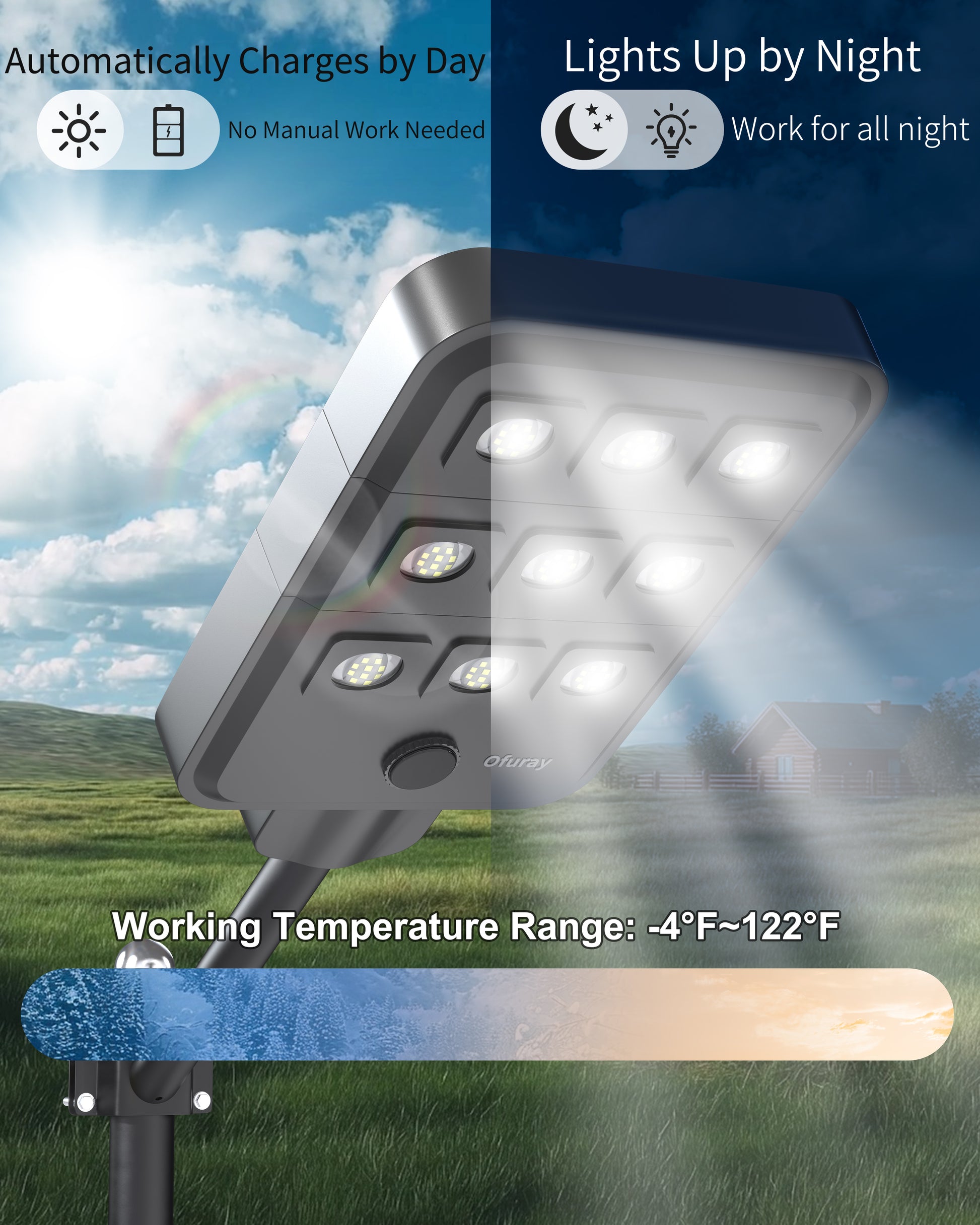 - Heavy-Duty & Waterproof Reliability:Built with 2mm thick ABS body and dual-layer premium waterproof gasket, rated IP67 waterproof. Operates in -4°F to 122°F, making these solar powered pole lights outdoor ideal for driveways, parking lots, yards, farms, and other all-weather environments