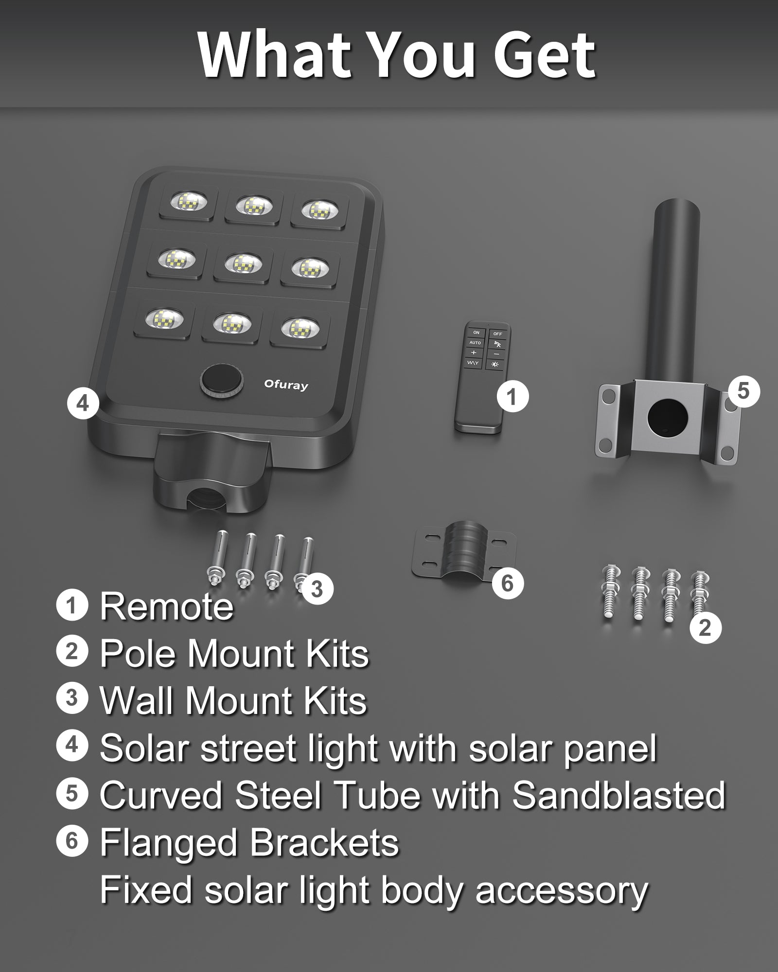 - 4 Smart Lighting Modes:The Ofuray ONY-Plus solar street lights outdoor feature 4 modes: (1) Dusk to Dawn auto on/off; (2) Motion Sensor – 20% standby to 100% brightness when motion is detected, then dims after 20s; (3) Adjustable brightness with 16 levels; (4) Always-On mode – charges 6–8 hrs for over 16 hrs of lighting