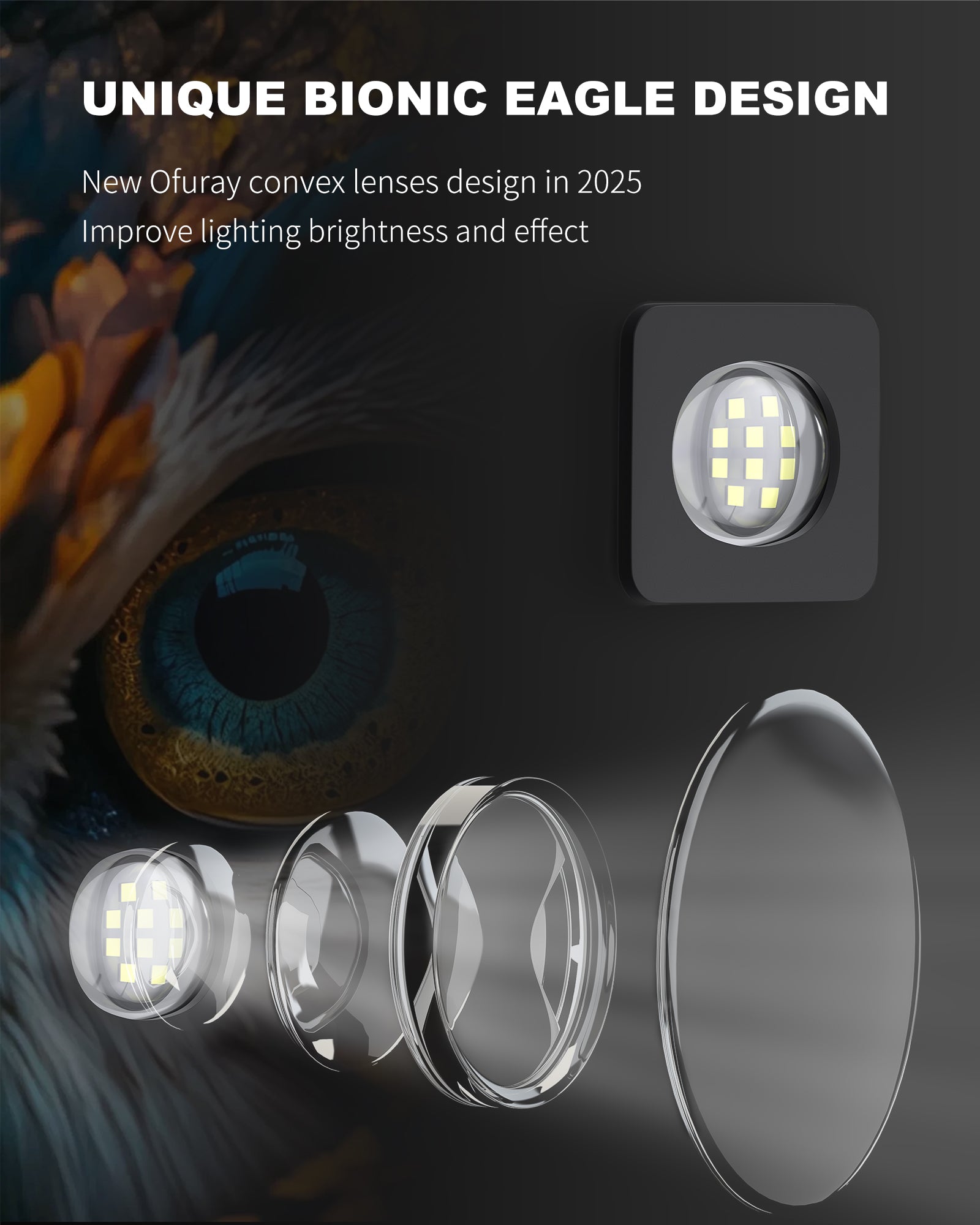- 2025 New Bionic Eagle Design:Upgraded 2025 version with Ofuray’s unique bionic eagle shape and convex lens design. Equipped with 90 Ultra-Bright 5054 LED beads (60,000 hrs lifespan) delivering 6500K daylight, ultra-wide-angle coverage up to 2,500 sq.ft,perfect for backyard, barns, farms, parking lots, garages, and street lighting